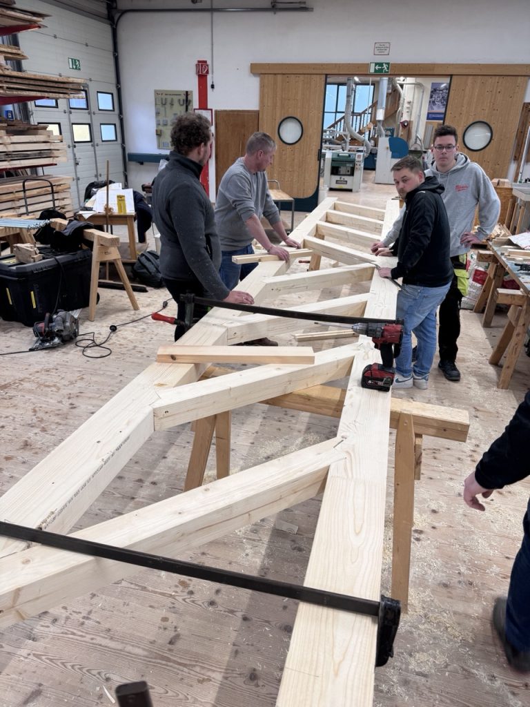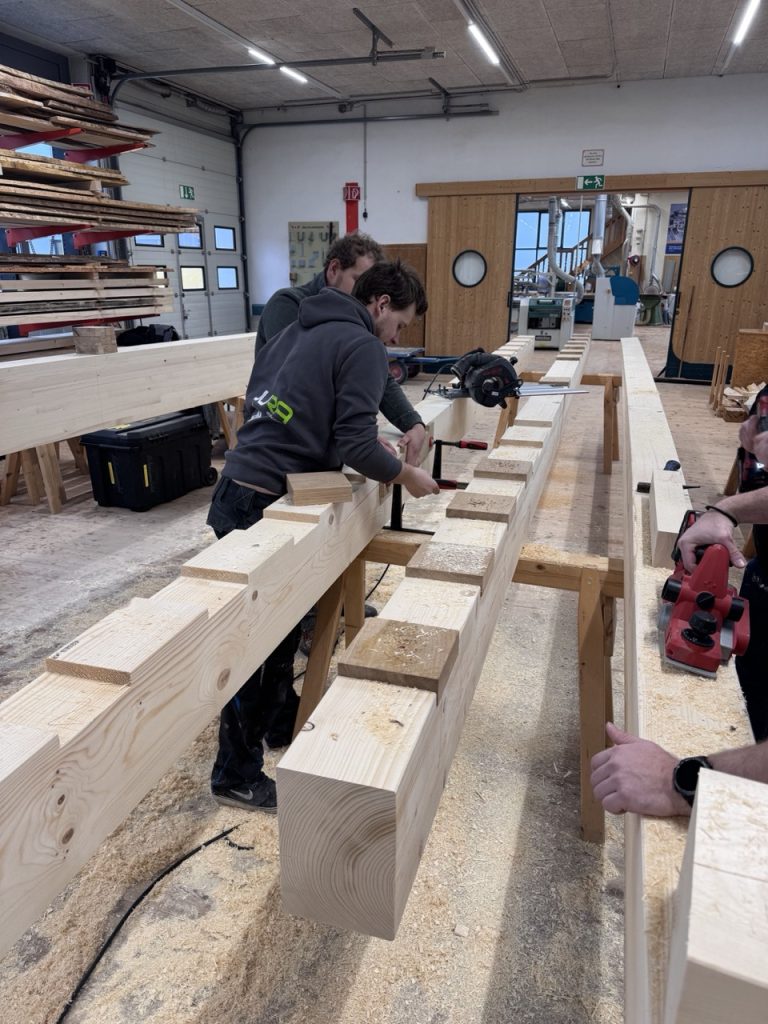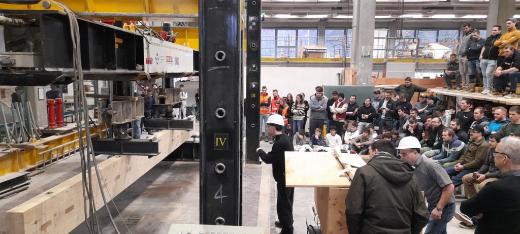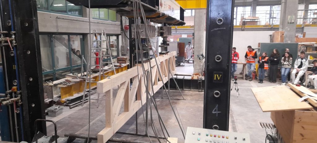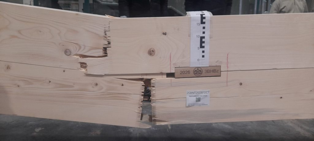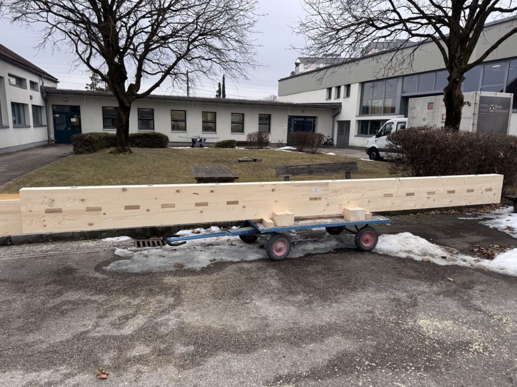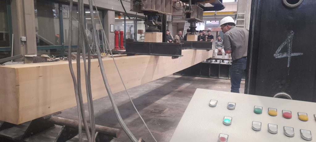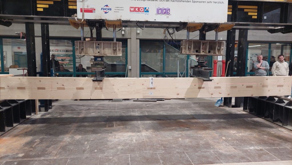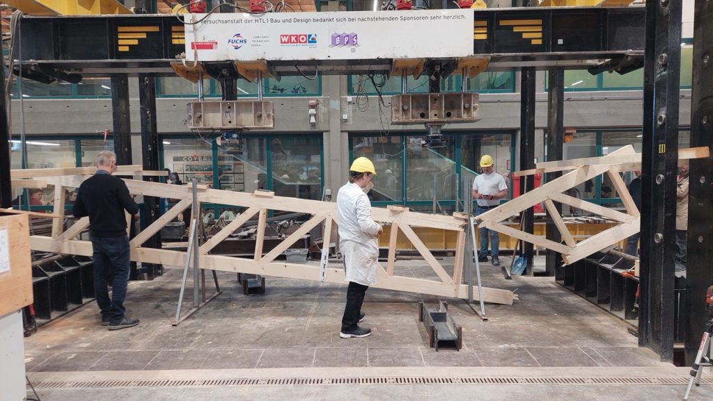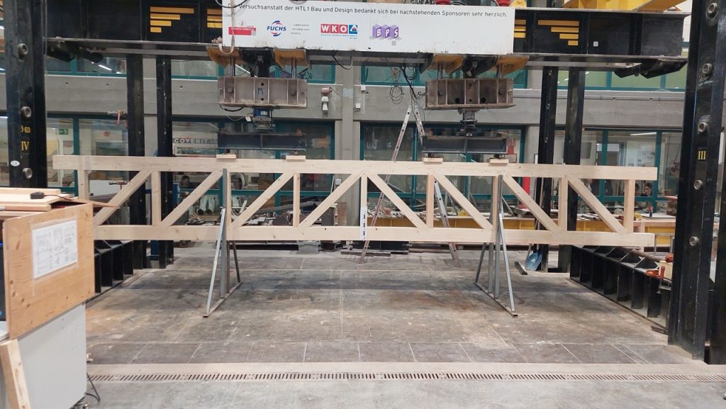 Die 3. Klasse Bauhandwerker hat auch heuer wieder einige Tragwerke gegenüberstellend untersucht. Am 25.2. wurden ein Stahlbetonträger, ein Brettschichtholzträger, ein verdübelter Balken und ein Holz-Fachwerk in der Bauteilpresse am Schulbauhof der HTL1 bis zum Bruch belastet und so die vorab ermittelten Rechenwerte mit realen Belastungsversuchen abgeglichen.