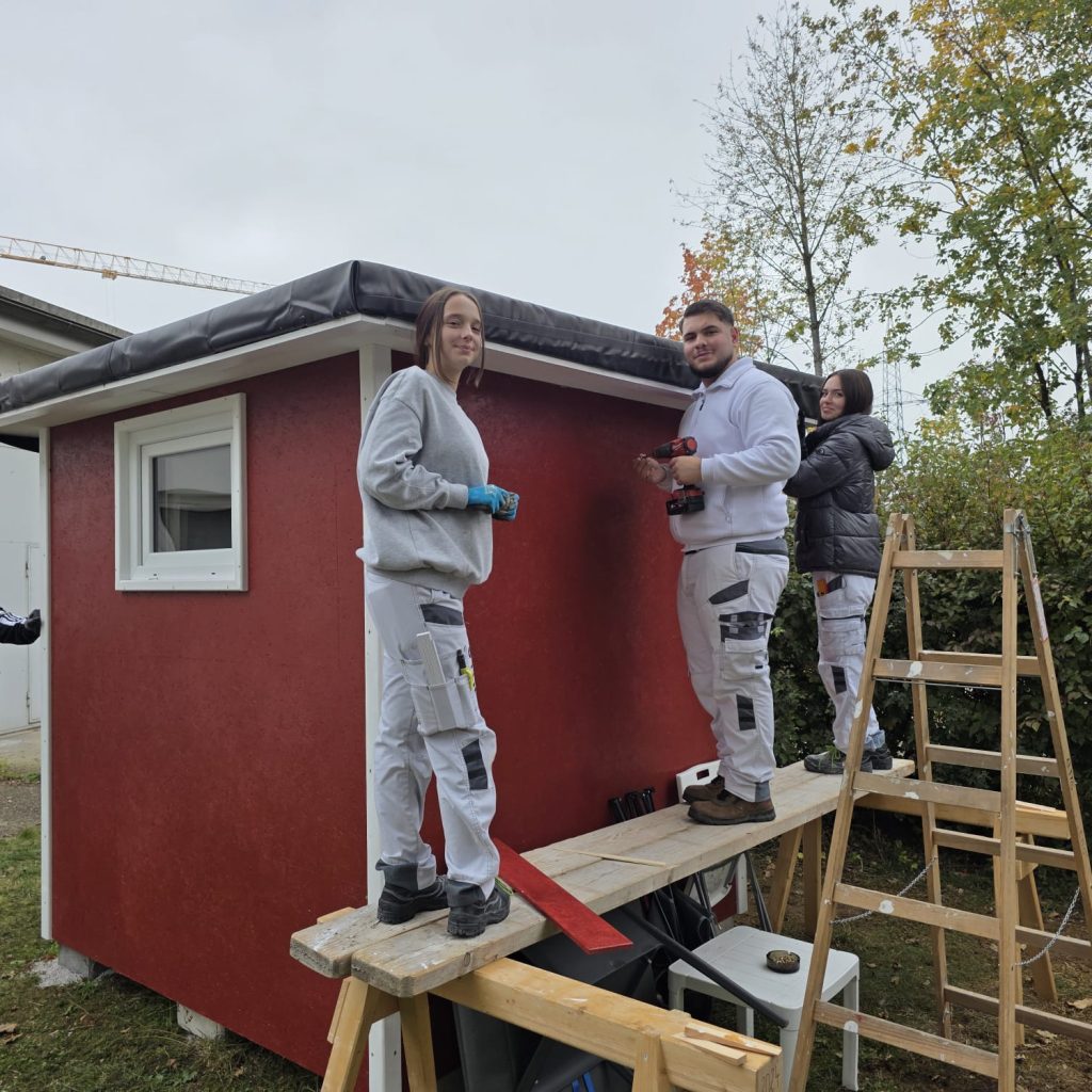 Am Montag 13.10. errichtete die 2BTC unter der Leitung von Walter Rabeder im Rahmen ihres Zimmereiunterrichts das mittlerweile 7. DüK, sozusagen ein „Winzighaus“ für einen Obdachlosen. DüK steht dabei für „Dach überm Kopf“ – es ist ein Witterungsschutz für Obdachlose. Genau gesagt, ist es ein 2 x 2 Meter großer, modular aufgebauter, kioskähnlicher und versperrbarer Witterungsschutz aus Holz, mit einer 8 cm Wärmedämmung. Ausgestattet ist es mit einer Klappbank einer kleinen Abstellfläche, einem Feuerlöscher und einem Erste Hilfe Paket.
